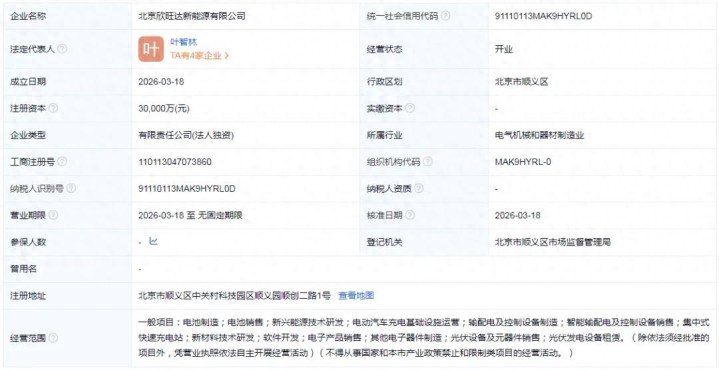 本网讯 近日,北京欣旺达新能源有限公司竖立,注册成本3亿元。该公司由欣旺达旗下欣旺达能源科技股份有限公司全资握股,筹谋规模包括电板制造、电板销售、新兴能源期间研发、电动汽车充电基础措施运营等。