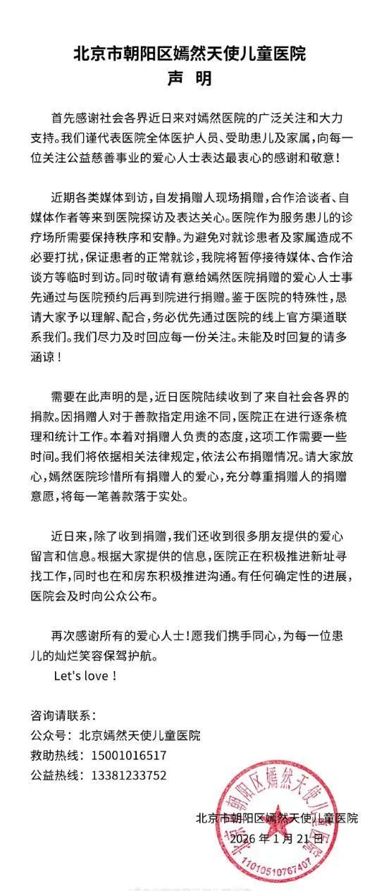 1月21日傍晚,嫣然天神儿童病院官方微博发文暗示,近日病院赓续收到了来自社会各界的捐钱。因捐赠东谈主关于善款指定用途不同,病院正在进行逐条梳理和统计处事。本着对捐赠东谈主崇拜的格调,这项处事需要一些本事。除了收到捐赠,咱们还收到许多一又友提供的爱心留言和信息。把柄大众提供的信息,病院正在积极鼓吹新居寻找处事,同期也在和房主积极鼓吹换取。有任何详情趣的发达,病院会实时向公众公布。
