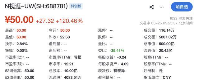乐居财经 吴文婷3月25日,视涯科技(688781.SH)在科创板挂牌上市,保荐机构为国泰海通证券。其开盘报50元,涨120.46%,总市值约500亿元。
