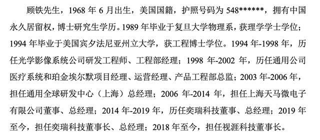 贵寓败露,顾铁,1968年6月出身,好意思国国籍,领有中国经久居留权,博士盘考生学历。1989年毕业于复旦大学物理系,获理学学士学位;1994年毕业于好意思国宾夕法尼亚州立大学,获工程博士学位。1994年-1998年,历任光学影像系统公司研发工程师、工程部司理;1998年-2002年,历任通用公司医疗系统和珀金埃尔默技俩司理、运营司理、产物工程部总监;2003年-2006年,担任通用大家研发中心(上海)总司理;2006年-2014年,担任上海天马微电子有限公司董事、总司理;2014年-2019年,历任奕瑞科技董事、总司理;2019年于今,担任奕瑞科技董事长、总司理;2018年于今,担任视涯科技董事长。