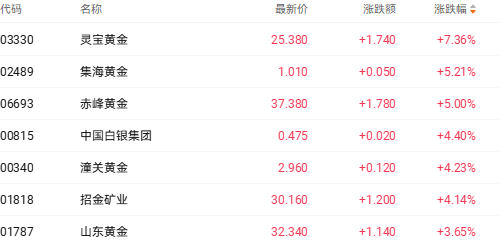财联社3月25日讯(剪辑胡家荣)港股黄金板块发挥强劲,多只龙头股权贵高潮。适度发稿,灵宝黄金(03333.HK)涨7.36%、集海黄金(02489.HK)涨5.21%、赤峰黄金(06693.HK)涨5%、潼关黄金(00340.HK)涨4.23%。