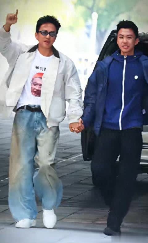 邓超更是拉着付航的手,主动地和粉丝打呼唤。